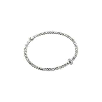 Prima è l’ultima nata nella famiglia Flex’it ed è una collezione dalla raffinata eleganza e leggerezza. La sua catena in maglie nasconde dozzine di minuscole molle in oro 18 carati che rendono i bracciali e gli anelli lisci e flessibili. Un movimento sobrio e divertente rappresentato da piccoli anellini in oro bianco con diamanti, un delicato e raffinato gioco di luci e riflessi. Anello Fope donna nuova collezione Prima in Oro bianco con diamanti taglio brillante. Realizzato in maglia flessibile con brevetto Flex’it. Diamanti incastonati per un totale di carati 0,07. Il gioiello è interamente realizzato a mano in Italia da mastri orafi e verrà spedito con scatola e garanzia originali.
