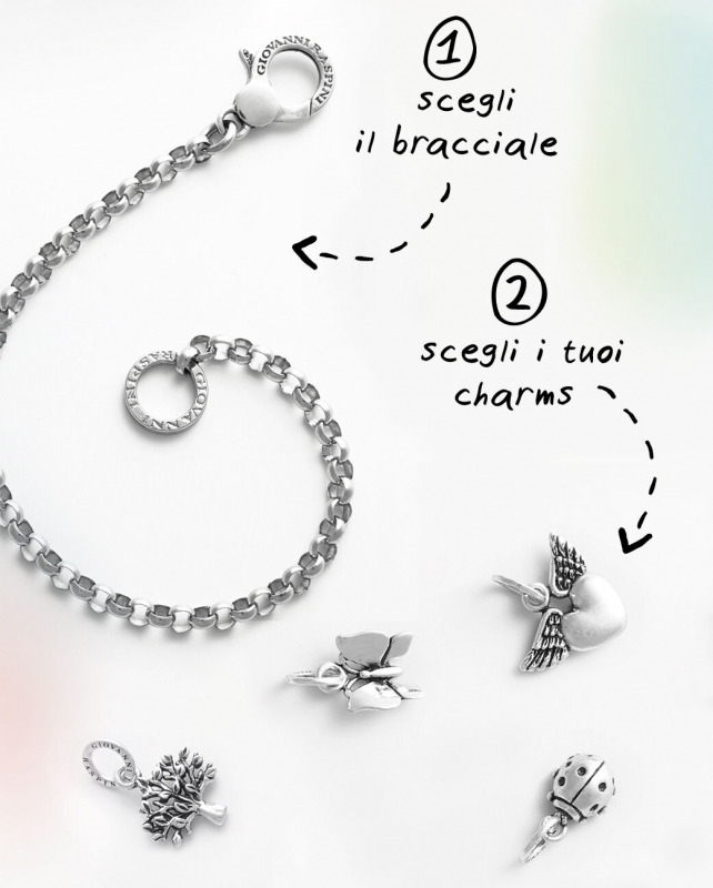 Bracciale in argento 925 di Giovanni Raspini. Interamente realizzato a mano in Italia da mastri orafi. Il bracciale lungo 19 cm è personalizzabile con tutti i charm originali di Giovanni Raspini.Immagini