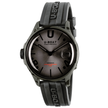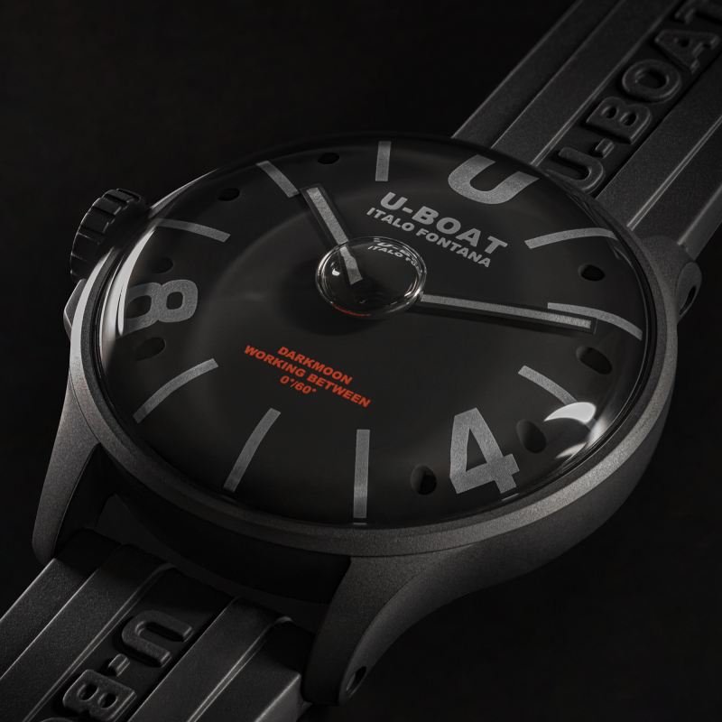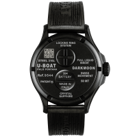 Orologio da uomo della collezione Darkmoon di U-BOAT. La cassa in acciaio AISI 316L con trattamento camouflage, completamente riempita di uno speciale olio che mette in risalto il quadrante, creando l’illusione dell’assenza del vetro, con un effetto di un nero più intenso e di una maggiore leggibilità. Bolla d'aria a vista sul quadrante per compensare le variazioni di temperatura. Distintivo proteggi corona a sinistra. Diametro 44,8 mm.Il quadrante bombato in metallo nero, indici e numeri trattati con superluminova grigio. Sfere in metallo verniciato con superluminova grigio.MOVIMENTO :la precisione Svizzera del movimento al quarzo Ronda 712.3 lubrificato in bagno d’olio.Fondo con innovativo sistema di chiusura (Locking Ring System) con sostituzione rapida della batteria. La scansione del QR code dà accesso ad un’esperienza digitale esclusiva.VETRO zaffiro di altissima qualità, bombato.FUNZIONI:ore, minuti, corona a vite.CINTURINO in gomma vulcanizzata ultra-resistente, colore nero, personalizzata con il logo della Maison in rilievo. Larghezza: 22/20 mm.IMPERMEABILITÀ:50 mt, 5 ATM. I'orologio verrà spedito con scatola e garanzia originali di due anni.Immagini