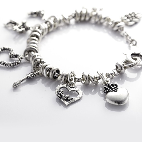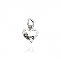 Charm in argento 925 * , Amorino su cuore di Raspini. Il charm è realizzato artigianalmente a mano in Italia, a forma di cuore. E' munito di maglina con logo Raspini e può essere inserito facilmente su collane, bracciali, portachiavi e orecchini per personalizzare con un tocco unico ogni gioiello.Immagini