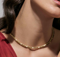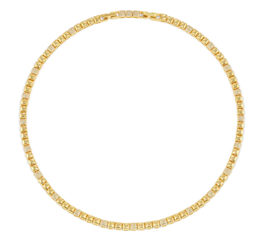 Collana in Argento e Pavé di Cubic Zirconia, con rivestimento superficiale, realizzato mediante bagno galvanico, in Oro Giallo. Questo gioiello unisce eleganza e luminosità in un design sofisticato, con le sue linee fluide e i suoi elementi geometrici. Un accessorio lussuoso che illumina ogni tuo momento con un tocco raffinato e contemporaneo. Il gioiello verrà spedito con scatola e garanzia originali.Immagini