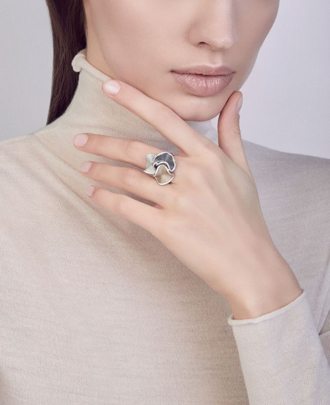 Unico nelle forme e nello stile, il design contemporaneo di Cammilli esalta i volumi scultorei dei gioielli, che con i loro movimenti giocano a valorizzare le pietre preziose. Le forme fluide ed essenziali si alternano a superfici setose dall’estetica inusuale. Anello Serie Sultana in Oro White Ice, Natural Beige e Black Lava 18Kt con Diamanti Dia ct. 0.48 Il gioiello verrà spedito con scatola e garanzia originali Annamaria CammilliImmagini
