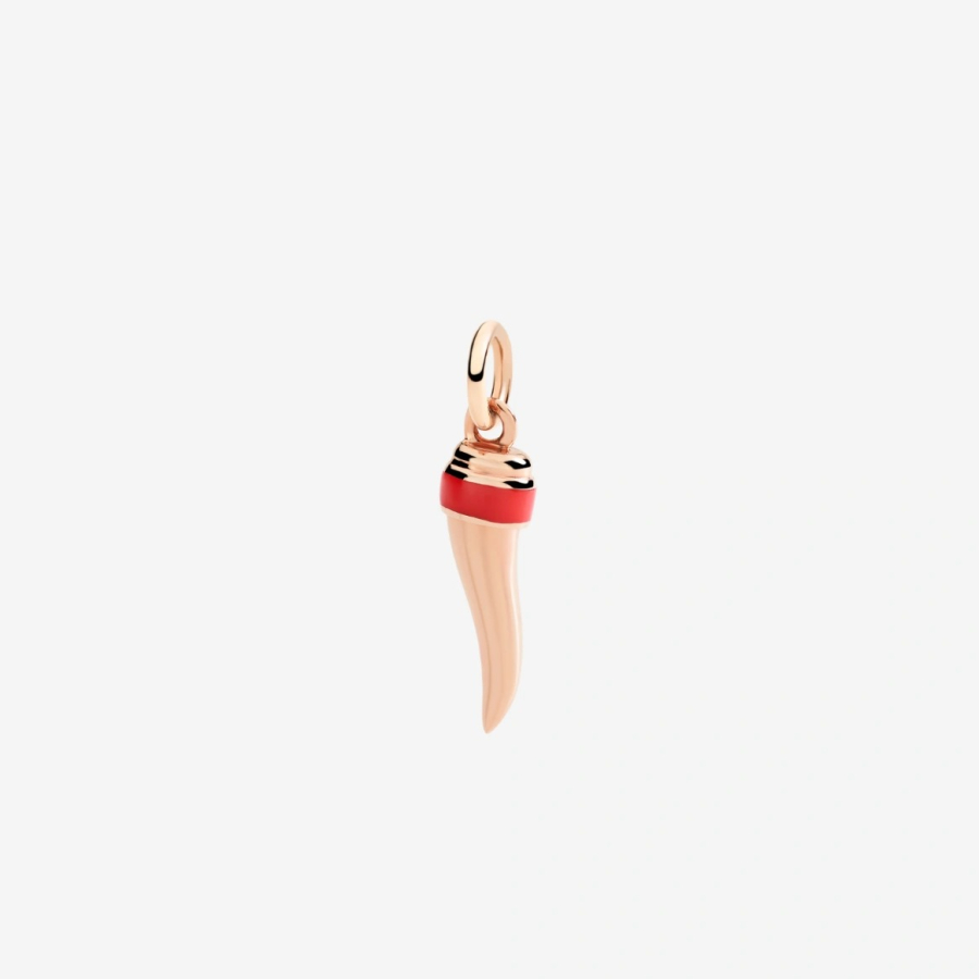 Ciondolo Corno in oro rosa 9K e smalto rosso. Booster di fortuna Le sue curve magiche attirano la fortuna, mentre la punta spazza via le vibrazioni negative. Un boost di energia positiva ispirato alla tradizione di Napoli, per chi sa che alla fortuna serve una piccola spinta. "Booster di fortuna". Il gioiello verrà spedito con scatola e garanzia originale DoDo.